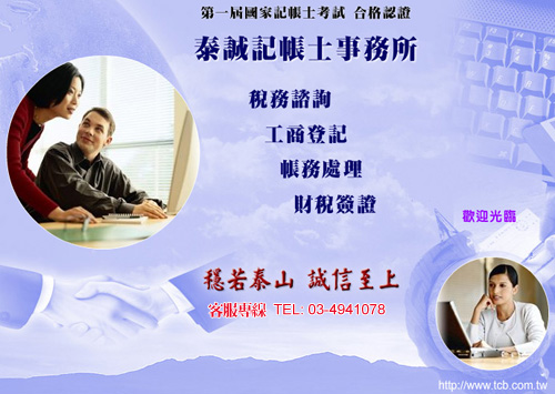 泰誠記帳士事務所自成立以來,始終堅持以專業的精神、誠懇的態度來協助客戶處理帳務上之問題,並提供優質的稅務服務。記帳、記帳士,公司行號設立,工廠申請設立,桃園稅務諮詢、桃園工商登記、桃園帳務處理、桃園財稅簽證,營業稅結算申報、營業稅清算申報、各類所得扣繳暨免扣繳申報、投資抵減......